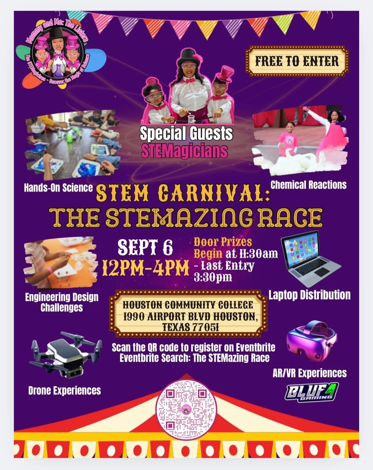 Events Dec 9 Young Women’s College Preparatory Academy STEAM Family Night Tuesday, December 9, 2025 5:30 PM 7:00 PM Young Women's College Preparatory Academy (map) Google Calendar ICS View Event → Oct 25 Birthday Bash Box Saturday, October 25, 2025 3:00 PM 6:00 PM 2808 Caroline Street Houston, TX, 77004 United States (map) Google Calendar ICS View Event → Oct 25 Crossed Over Kids Harvest Festival Saturday, October 25, 2025 3:00 PM 6:00 PM 12332 Perry Road Houston, TX, 77070 United States (map) Google Calendar ICS View Event → Oct 18 Energy Day STEM Festival Saturday, October 18, 2025 11:00 AM 3:00 PM Sam Houston Park (map) Google Calendar ICS View Event → Sep 6 Mommy and Me: The Listers STEM Carnival Saturday, September 6, 2025 12:00 PM 4:00 PM Houston Community College (map) Google Calendar ICS View Event →