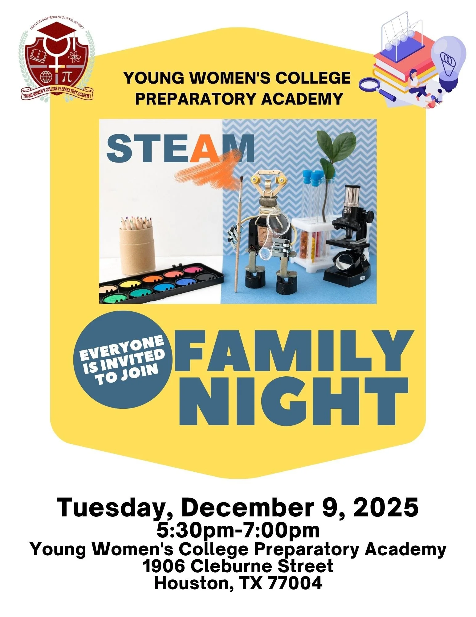 Back to All Events Young Women’s College Preparatory Academy STEAM Family Night Tuesday, December 9, 2025 5:30 PM 7:00 PM Young Women's College Preparatory Academy 1906 Cleburne Street Houston, TX, 77004 United States (map) Google Calendar ICS