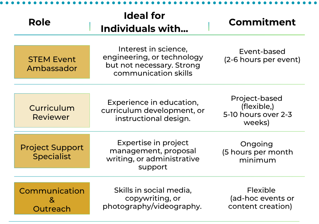 Leverage Your Expertise: Apply your professional skills (whether in STEM, project management, or communications) to high-level program design and execution.